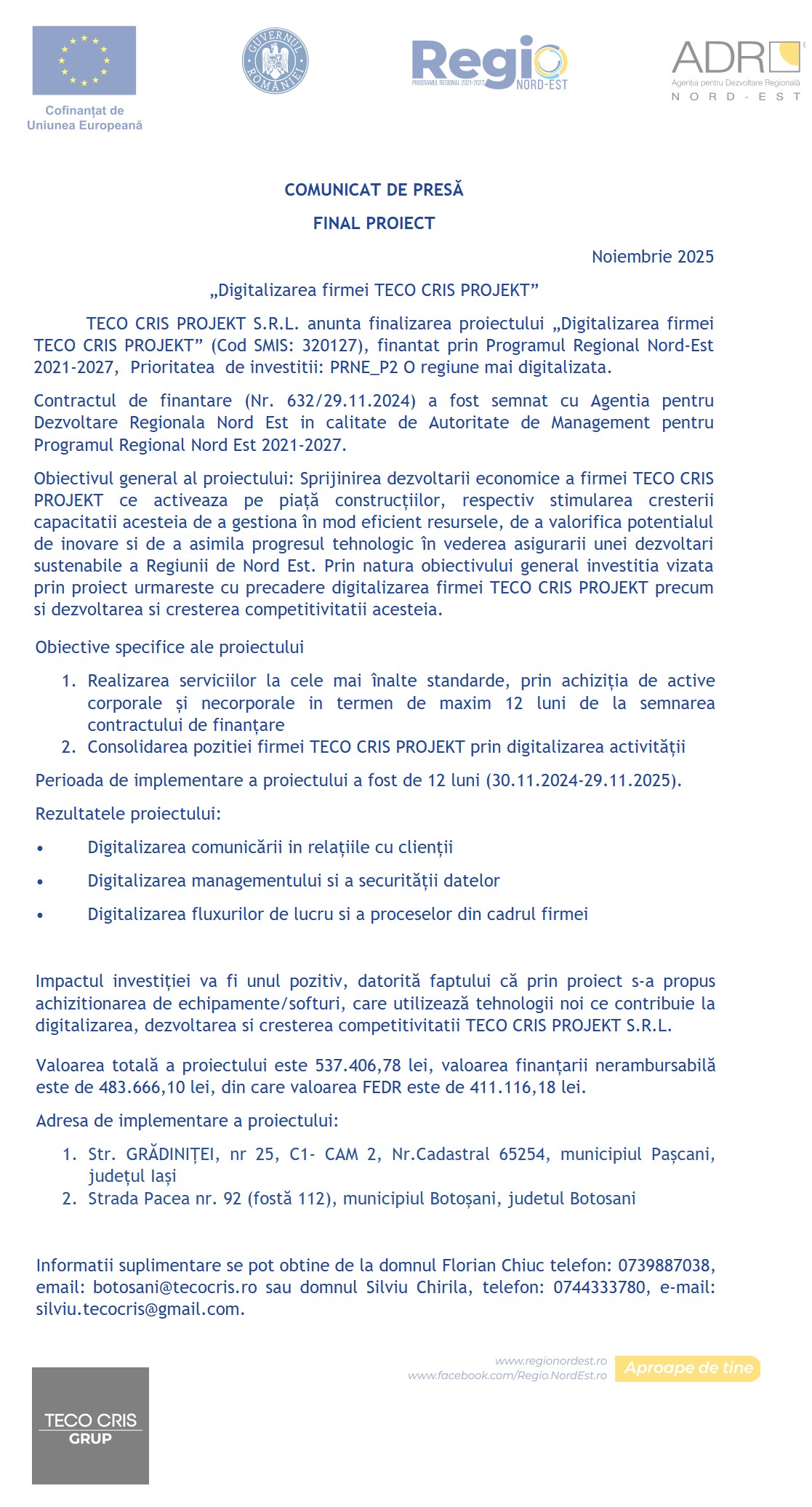 Ultimul paragraf a fost adăugat aici: investiția a vizat dotarea cu echipamente și softuri moderne, menite să crească competitivitatea și să asigure dezvoltarea sustenabilă a TECO CRIS PROJEKT S.R.L. Valoarea totală a proiectului a fost de 537.406,78 lei, din care o finanțare nerambursabilă de 483.666,10 lei, incluzând 411.116,18 lei proveniți din Fondul European de Dezvoltare Regională. Site-ul botosaninews.ro menționează că această investiție digitală are un impact pozitiv asupra afacerii.