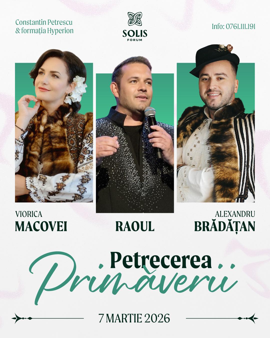 Seara va fi animată de prezența lui Viorica Macovei și Alexandru Brădățan, care vor interpreta melodii de muzică populară autentică. Raoul se va alătura acestui lineup, aducând momente emoționante și șlagăre cunoscute, care vor încânta publicul. De asemenea, Constantin Petrescu & Formația Hyperion sunt așteptați să mențină ringul de dans plin, oferind o atmosferă vibrantă pe tot parcursul evenimentului.